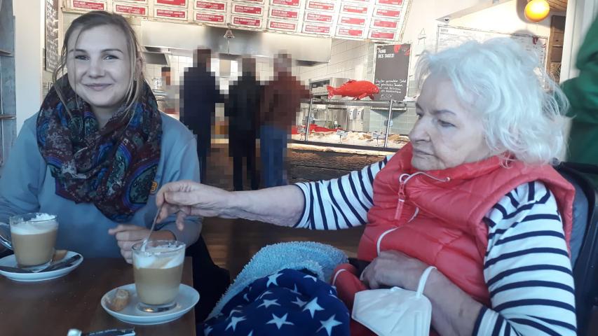 „Mithilfe eines Transportstuhls brachten wir Frau G. vom 2. Stock herunter zum Wünschewagen. Von dort aus fuhren wir bis zum Hafen, wo wir dann einen Spaziergang bis zur Hafenspitze unternahmen. Frau G. erzählte, dass sie früher in Hafennähe gearbeitet habe. Sie schien erfreut, ihre alten Arbeitsstätten noch einmal zu sehen. Am Hafen tranken wir gemeinsam einen Kaffee und es ging weiter Richtung Innenstadt zu einem Bummel durch die Fußgängerzone. Die Tochter zeigte ihrer Mutter die Veränderungen der Stadt in den letzten Jahren. Wir bummelten durch ein Geschäft und gingen entlang der Schaufenster.